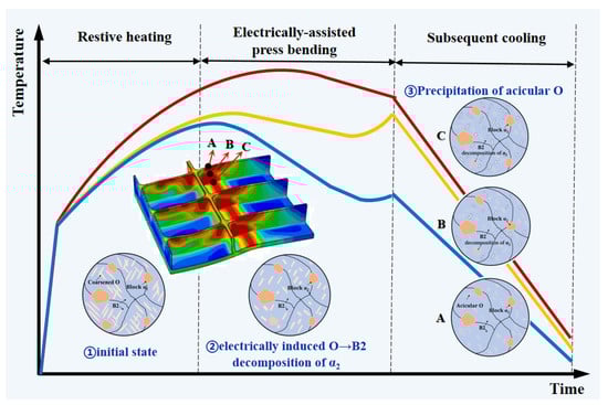 A knowledge of the process–structure–property correlation and underlying deformation mechanisms of material under a coupled electro-thermal–mechanical field is crucial for developing novel electrically assisted forming techniques. In this work, numerical simulation and experimental analyses were carried out to study the non-uniform deformation behaviors and microstructure evolution of Ti2AlNb-based alloy stiffened panels in different characteristic deformation regions during electrically assisted press bending (EAPB). The quantitative relationships between electro-thermal–mechanical routes, microstructural features, and mechanical properties of EAPBed stiffened panels were initially established, and the underlying mechanisms of electrically induced phase transformation and morphological transformation were unveiled. Results show that the temperature of the panel first increases then deceases with forming time in most regions, but it increases monotonically and reaches its peak value of 720.1 °C in the web region close to the central transverse rib. The higher accumulated strain and precipitation of the acicular O phase at mild temperature leads to strengthening of the longitudinal ribs at near blank holder regions, resulting in an ideal microstructure of 3~4% blocky α2 phase + a dual-scale O structure in a B2 matrix with a maximal hardness of 389.4 ± 7.2 HV0.3. While the dissolution of the α2 phase and the spheroidization and coarsening of the O phase bring about softening (up to 9.29%) of the lateral ribs and web near the center region, the differentiated evolution of microstructure and the mechanical property in EAPB results in better deformation coordination and resistance to wrinkling and thickness variation in the rib–web structure. The present work will provide valuable references for achieving shape-performance coordinated manufacturing of Ti2AlNb-based stiffened panels.