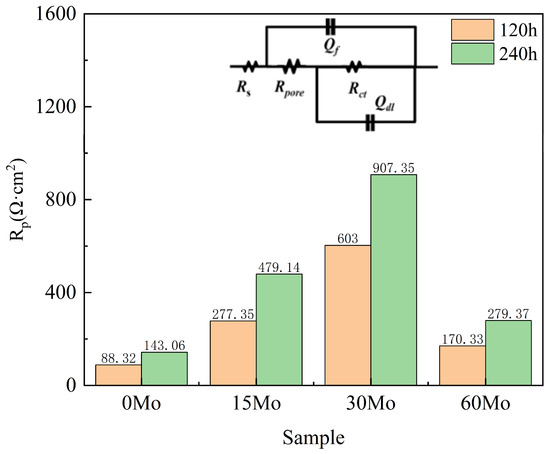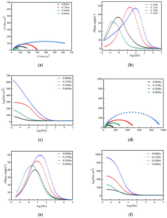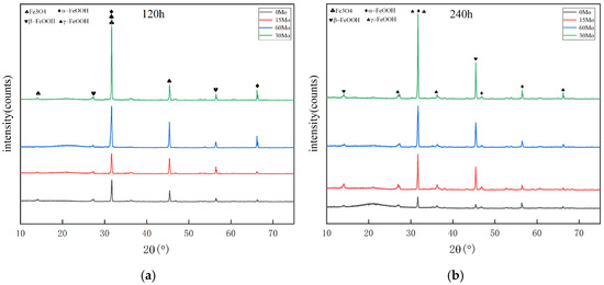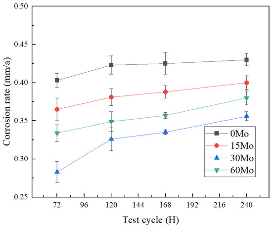To explore the improvement of the corrosion resistance of the inner bottom plate of corrosion-resistant storage tank steel and the effects and underlying mechanisms of varying molybdenum (Mo) contents (0Mo, 0.15 wt.%Mo, 0.30 wt.%Mo, and 0.60 wt.%Mo), a systematic study is conducted on the corrosion performance of the steel in a simulated environment (10 wt.% NaCl solution, 30 ± 1 °C). The findings reveal that the steel containing 0.3 wt.% Mo possesses superior corrosion resistance. An optimal dosage of Mo refines corrosion products and fills voids via the formation of nano-scale MoO2/MoO3 particles, mediates the evolution of γ-FeOOH towards α-FeOOH, and improves the protective capability and electrochemical stability of the rust layer. Nevertheless, excessive Mo leads to the residual of elemental Mo arising from incomplete oxidation, which constructs a galvanic cell with Fe, thereby accelerating corrosion. Additionally, an excessively high proportion of MoO3 triggers elevated internal stress and structural degradation of the rust layer. Full article