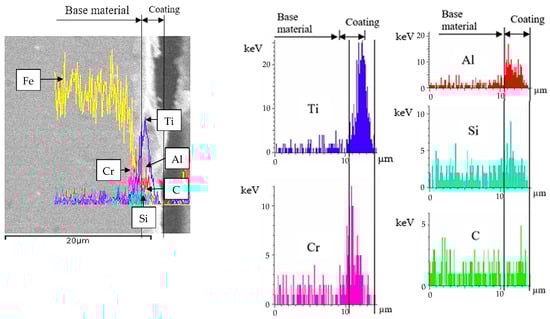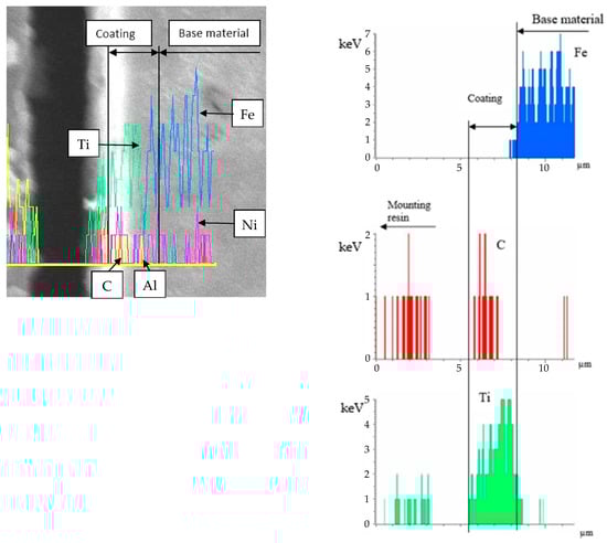 Figure 3 shows the presence of Ti and C in the coating in the range from 5.5 to 8.5 µm. Elements transferred to the mounting resin during polishing are visible up to 3 µm away. The range from 3 to 5.5 µm is the gap between the mounting resin and the coating. Titanium is the basic element in the coating, and its bond with the substrate, where the most abundant element is iron, is evident in the range from 8 to 8.5 µm.