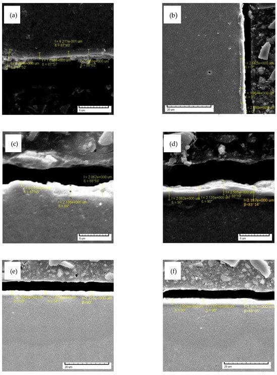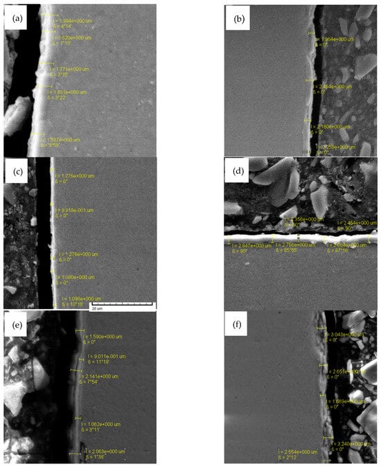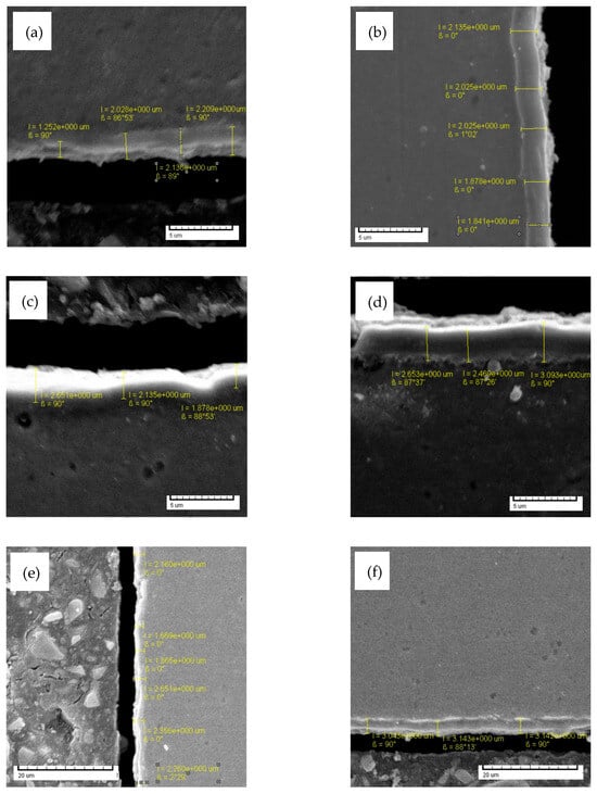 Figure 5, Figure 6 and Figure 7 illustrate SEM micrographs with measured coating thicknesses for each steel grade, applied heat treatment, and coating type.