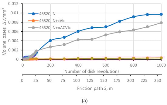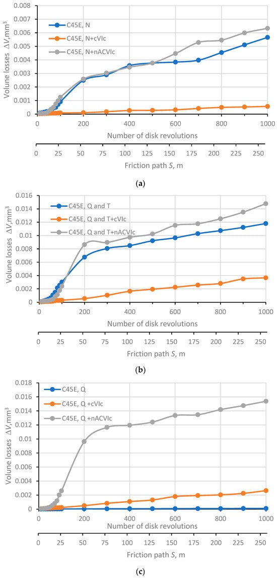 The mean values of the calculated volume losses for two repeated measurements (in the range from 0 to 1000 revolutions) for 45S20 steel in the normalised (N), quenched and tempered (Q and T), and quenched (Q) condition, with cVIc and nACVIc coating and without coating, are shown in Figure 9.