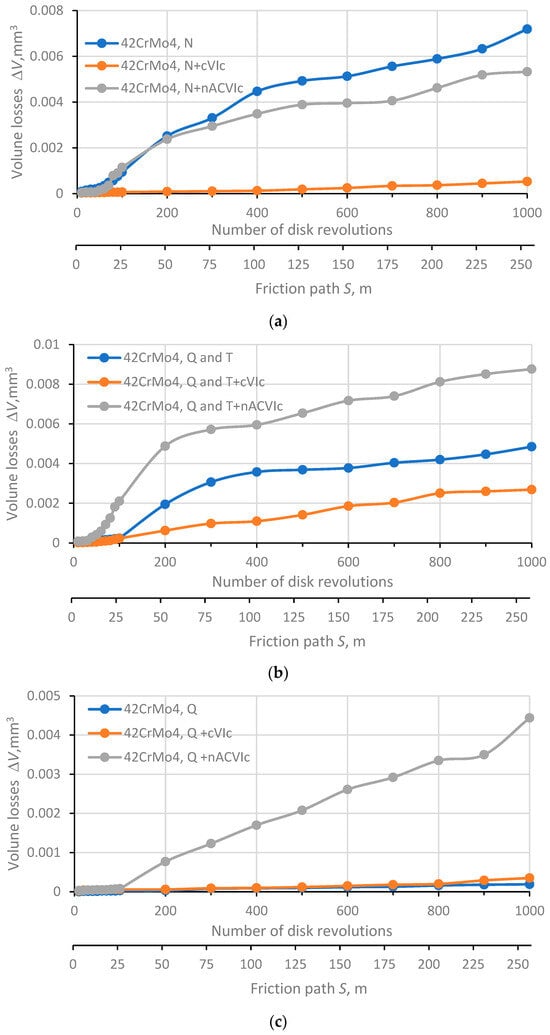 Volume losses of 42CrMo4 steel with cVIc and nACVIc layer and without coating: (a) normalised; (b) quenched and tempered; (c) quenched.