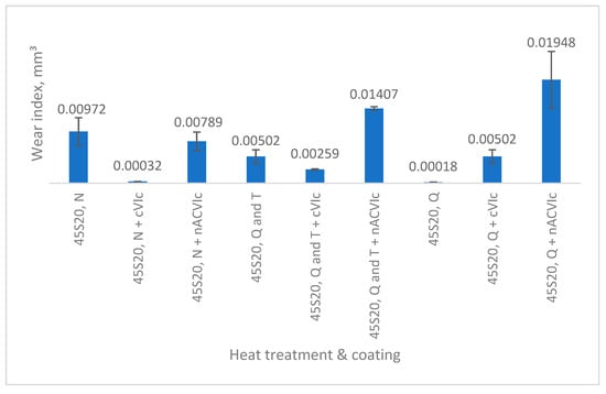 The influence of cVIc and nACVIc PVD coatings on the adhesive wear resistance of normalised, quenched and tempered and quenched structural steels 45S20, C45E and 42CrMo4 was analysed by comparing the wear index. Wear index is used to quantify the wear resistance of different materials; materials with a lower wear index have better wear resistance. The wear index was calculated using the volume loss method after 1000 revolutions. The volume wear index is determined according to Equation (2) [23]: