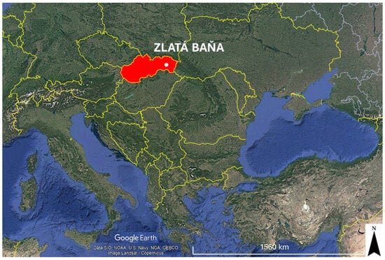 The study focuses on an exploration stockpile from the abandoned Zlatá Baňa site (“Golden Mine”), located in the Eastern Carpathians in the northern part of the Slanské Vrchy Mountains (Prešov District, Prešov Region, Slovakia, Europe) (Figure 1) [11].
