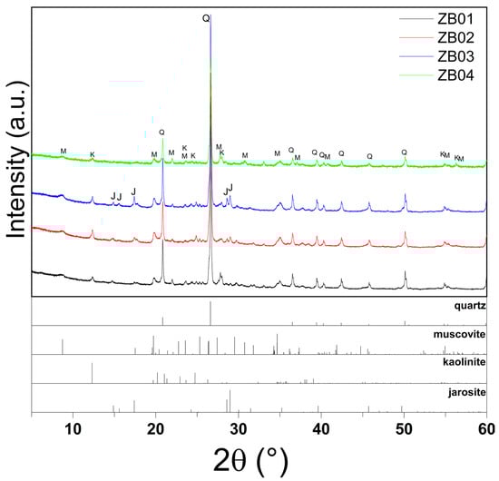 XRPD patterns of samples ZB01–ZB04, highlighting quartz (Q), muscovite (M), kaolinite (K), and jarosite (J) peaks in ZB02–ZB03, the absence of jarosite in ZB01, and the exclusive presence of muscovite and kaolinite in ZB04.