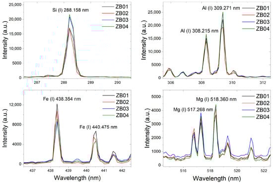 All LIBS spectra consistently displayed the characteristic emission lines of Si (288.158 nm), Al (309.284 nm), Fe (438.354 nm), and Mg (518.360 nm) (Figure 6), further confirming the elemental composition previously determined by XRF and SEM–EDS analyses. The detection of these emission lines is fully consistent with the mineralogical assemblage identified in the solid samples, reflecting the dominance of silicate and aluminosilicate phases (e.g., muscovite and kaolinite) and the presence of Fe-bearing minerals such as jarosite and goethite.