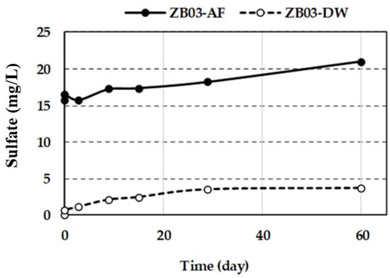 Figure 11 and Figure 12 summarize the temporal evolution of pH and sulfate concentrations during the bioleaching assays. In the inoculated system (ZB03-AF), pH decreased slightly from 2.0 to 1.84 over the 60-day period. This limited acidification suggests a potential buffering effect caused by the concomitant dissolution of silicate minerals, as evidenced by the steady release of Al which likely buffered the system due to their inherent reactivity. This buffering mechanism, driven by the consumption of protons (H+) during the breakdown of aluminosilicate frameworks, is a well-documented geochemical process in weathered mine waste environments [31]. The gradual release of Al3+ into the solution serves as a proxy for the acid-neutralizing capacity of the gangue minerals [31], explaining the observed pH stabilization. While direct microbial population data were not collected, this decline in pH, coupled with the iron and sulfate dynamics, is consistent with the active microbial oxidation of Fe2+, a hallmark of bioleaching processes driven by acidophilic consortia.