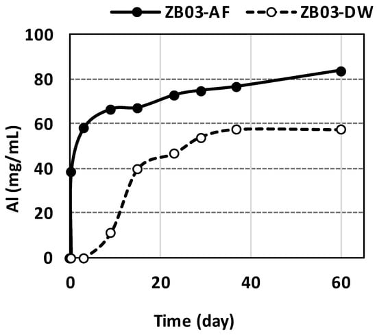 Microbial activity markedly enhanced metal solubilization, particularly for zinc. Zn mobilization in ZB03-AF was detectable from day 1, reaching a maximum of 8.3 mg/mL by day 60 (Figure 14) [33]. Crucially, Zn concentrations in the abiotic controls reached only ~50% of the biotic values, underscoring the catalytic role of the bacterial consortium. In ZB03-DW, Zn release was attributable to intrinsic acid-generating minerals.
