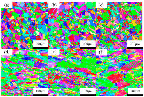 Inverse Polarization Figure (IPF) of 321 stainless steel after unloading from different tensile stresses: (a) 0 MPa; (b) 300 MPa; (c) 430 MPa; (d) 610 MPa; (e) necking stage; (f) fracture stage.