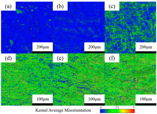 EBSD testing was performed on the as-received specimen, as well as on specimens subjected to varying tensile stresses. The resulting inverse polar figures (IPFs) are shown in Figure 5. When 321 stainless steel was stretched into the plastic stage (Figure 5c), a distinct color gradient appeared within the grains compared to the as-received specimen (Figure 5a), indicating an increase in local orientation gradients. This trend became more pronounced as strain increased. The continuous color transition within grains reflects the fact that, as plastic damage accumulates, the orientation distribution within grains tends to diverge. Local regions undergo lattice rotation, forming substructures and introducing orientation differences.