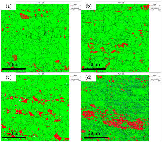 Figure 7 shows the Ph + GB diagram of 321 stainless steel under different tensile stresses (between 0 MPa and 610 MPa). It reveals a clear trend in martensite content. Even without applied tensile stress (0 MPa), a small amount of martensite (3.6%) is present in the material, likely originating from localized strain in the original microstructure or processing history. As the tensile stress increased to 300 MPa, the martensite content increased slightly, reaching 4%. This indicates that, at this stage, stress had not yet triggered significant phase transformations; deformation was likely still dominated by slip and twinning. When the stress increased further to 430 MPa, the martensite content increased markedly to 8.6%, indicating that the stress had exceeded the critical threshold for inducing martensitic transformation. Strain-induced martensitic transformation (SIMT) then began to occur significantly. This phenomenon is closely related to the metastable characteristics of austenitic stainless steel. Under stress, a portion of the austenite transforms into α′-martensite via a shear mechanism, which enhances the material’s strength and hardening capacity. When the stress reached 610 MPa, the martensite content increased further to 12.5%. At room temperature, the formation of additional martensite resulting from sustained plastic deformation induced by tensile stress has a more pronounced strengthening effect on the phase transformation.