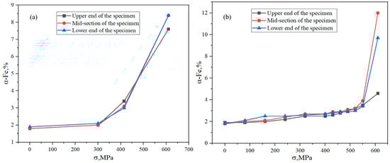Variation in ferromagnetic phase percentage under different stresses: (a) unloading measurement; (b) in situ measurement.