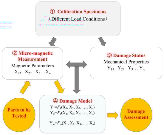 Using micro-magnetic measurement techniques (such as magnetic Barkhausen noise and coercive force), a correlation model can be established that links the macroscopic mechanical properties of 321 stainless steel with its magnetic parameters based on the aforementioned magneto-mechanical coupling mechanism. The specific steps are as follows: First, acquire multiple magnetic signals from the test specimen using micro-magnetic sensors. Second, apply varying degrees of damage to the material through conventional mechanical tests, such as tensile and fatigue testing, and measure the corresponding magnetic characteristic values. Finally, analyze the data to establish quantitative relationships between magnetic parameters and mechanical performance indicators, expressed as calibration equations, thus constructing a mechanical property evaluation model based on magnetic signals. In practical applications, substituting magnetic parameters measured on actual components into this model enables indirect assessment of material damage states. Figure 13 illustrates the corresponding damage assessment workflow.