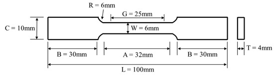 The mechanical properties of the investigated alloys were evaluated through Vickers hardness and tensile tests. Vickers hardness tests were conducted using a Vickers hardness tester (HV-110D, Mitutoyo, Tokyo, Japan). The measurements were performed on metallographically polished specimen surfaces to ensure clarity. A load of 10 kgf was applied with a dwell time of 10 s. To ensure statistical reliability, ten indentations were performed for each condition, and average values with standard deviations were reported. Tensile tests were carried out at room temperature using a universal testing machine (KDMT-158, Kyung Do Precision, Gyeonggi-do, Republic of Korea). The tensile specimens were machined according to the specific geometry shown in Figure 2. The tests were conducted at a constant crosshead speed of 1 mm/min. To guarantee reproducibility, a total of six specimens were tested for each condition.