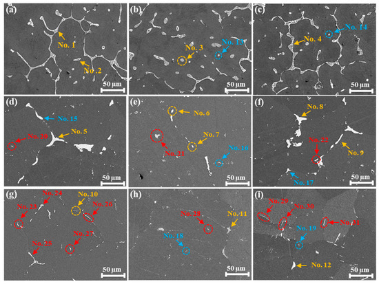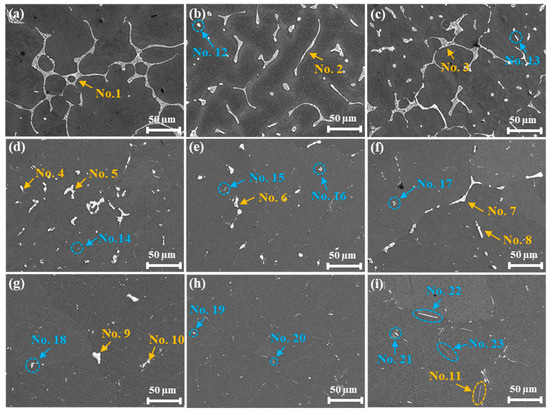 SEM micrographs showing the microstructural evolution of CZ alloys under different heat treatment conditions: (a–c) as-cast, (d–f) T4 heat treatment condition, and (g–i) T6 heat treatment condition. The images correspond to the (a,d,g) 2CZ, (b,e,h) 4CZ, and (c,f,i) 6CZ alloys.