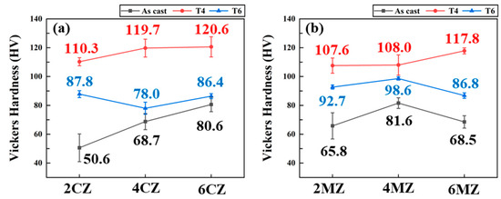 Variations in Vickers hardness of the investigated alloys as a function of alloying content and heat treatment condition: (a) CZ; (b) MZ combination.