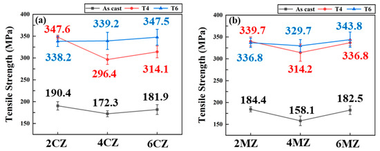 Variations in tensile strength of the investigated alloys as a function of alloying content and heat treatment condition: (a) CZ; (b) MZ combination.