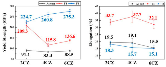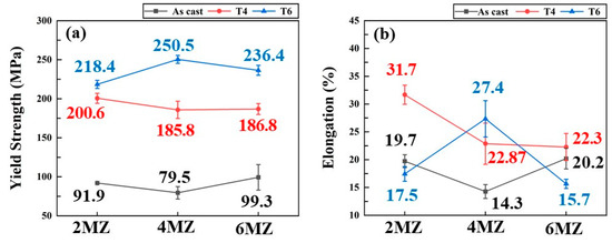 The variations in yield strength (YS) and elongation for the CZ and MZ alloy series are summarized in Figure 7 and Figure 8, respectively. To evaluate the structural performance, the relationship between strength and ductility was analyzed with a focus on the trade-off behavior typically observed in precipitation-hardened alloys. As shown in Figure 7, the CZ series exhibited a classic inverse correlation between strength and ductility. For the 4CZ alloy, the T4 condition resulted in the lowest yield strength (115.8 MPa) but the highest elongation (37.7%), indicating a matrix dominated by dislocation glide capability. However, upon T6 aging, the yield strength surged to 260.8 MPa while the elongation dropped sharply to 15.7%. This drastic shift demonstrates that in the CZ system, strength gains are achieved at the direct expense of ductility. In distinct contrast, the MZ series, particularly the 4MZ alloy (Figure 8), demonstrated an exceptional capability to overcome this conventional trade-off. Under the T4 condition, the 4MZ alloy showed a yield strength of 185.8 MPa and an elongation of 22.9%. Remarkably, the T6 aging treatment triggered a simultaneous enhancement in both properties with the yield strength increased to 250.5 MPa, and the elongation improved to 27.4%. Unlike the CZ series, where aging significantly reduced ductility, the 4MZ–T6 condition achieved a superior strength–ductility balance. This suggests that the microstructural evolution in the 4MZ–T6 alloy effectively manages internal stress, maintaining high deformability even at elevated strength levels.