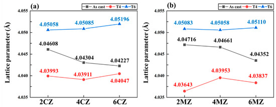 Variations in lattice parameter of the investigated alloys as a function of alloying content and heat treatment condition: (a) CZ; (b) MZ combination.