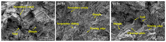Scanning electron micrographs of fracture surfaces under different heat treatment conditions: (a) As cast, (b) T4 heat treatment condition, (c) T6 heat treatment condition.