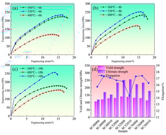 Solid-solution-state room-temperature compression engineering stress–strain curve: (a) curve under different solid-solution temperatures for 6 h; (b) curves at different solid-solution temperatures for 8 h; (c) curves at different solid-solution temperatures for 10 h; (d) mechanical properties diagram of solid-solution state.