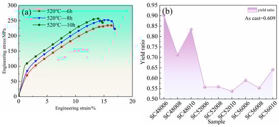 Compressive mechanical properties of solid solution at room temperature: (a) compression engineering stress–strain curves at room temperature with different holding time at 520 °C; (b) yield ratio diagram.