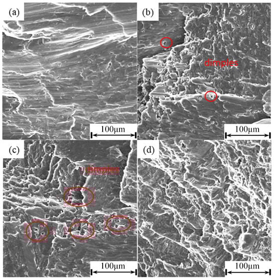 Figure 9 shows the compressive fracture morphologies of the as-cast specimen and the specimens solution treated at 520 °C for different durations. The as-cast sample exhibits prominent cleavage steps and lamellar tearing features, indicative of a quasi-cleavage fracture mode. This is primarily due to the continuously distributed brittle secondary phases (e.g., eutectic phases) in the interdendritic regions of the as-cast structure. These phases form weak interfaces along grain boundaries and interdendritic zones, promoting rapid crack propagation and resulting in the material’s relatively low plasticity and toughness. After solution treatment at 520 °C, the fracture morphology gradually evolves with prolonged holding time. Following treatment for 6 h, several shallow dimples begin to appear on the fracture surface, and the cleavage facets become more fragmented. This suggests that the solution treatment promotes the dissolution of some brittle phases, leading to more tortuous crack paths and improved toughness compared with the as-cast condition. When the treatment time is extended to 8 h at 520 °C, dimple features become more noticeable and are accompanied by evident tear ridges, indicating that the connectivity of the brittle secondary phases is further disrupted. This impedes crack propagation and contributes to a transition from quasi-cleavage to a mixed ductile fracture mode, accompanied by the most significant improvement in plasticity. However, after extending the solution time to 10 h, the fracture surface displays numerous small cleavage facets along with river patterns. These features are likely associated with the excessive formation of LPSO phases, which reduces deformation compatibility, as well as stress concentration induced by rare-earth-rich phases, collectively leading to a decrease in plasticity. These observations align with the previously discussed mechanical properties and microstructural characterization, confirming the reduction in material plasticity under these conditions.