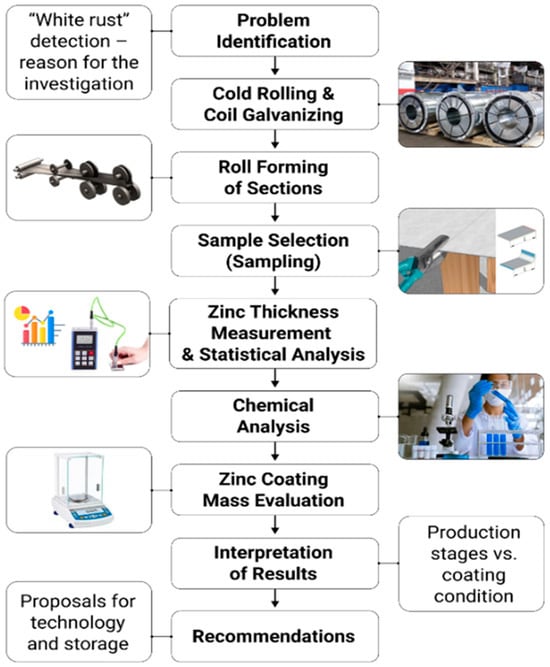 The research methodology was developed to enable a comprehensive analysis of the technological process for manufacturing CFS from galvanized steel. It focused on identifying critical production stages, selecting representative specimens, and applying physicochemical and instrumental methods to evaluate the zinc coating. The logical and structural framework of the study is presented in Figure 2.