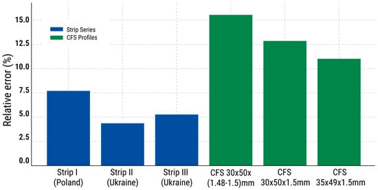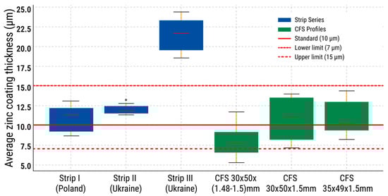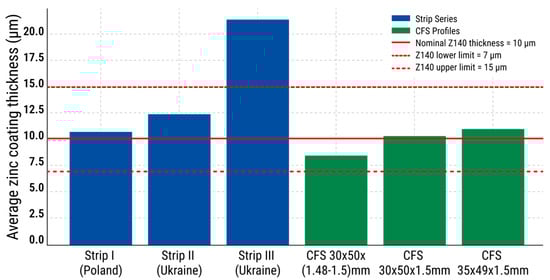 The typical zinc coating thickness according to the Z140 standard (EN 10346:2015) is 10 μm, with a recommended range of 7–15 μm. The comparison was carried out using the actual results obtained from strip blanks (t =1.03–1.5 mm) and finished CFS (t = 1.5 mm and t = 1.48–1.5 mm), taking into account the dimensional types. The data processing was performed separately for each specimen (with the total number of measurements, i.e., the full sample size, equal to N = 33). The results of statistically consistent specimens were considered valid and used for further analysis.