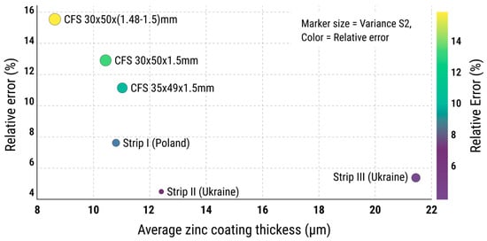 - From a quantitative standpoint, the obtained results indicate that the risk of zinc coating degradation increases markedly when the average zinc coating thickness decreases below 10 µm and becomes critical at values around 8.6 µm. Elevated thickness variance (S2) and relative deviations above 15% may therefore be considered practical indicators for identifying high-risk production batches during quality control of galvanized coils and CFS.