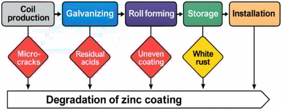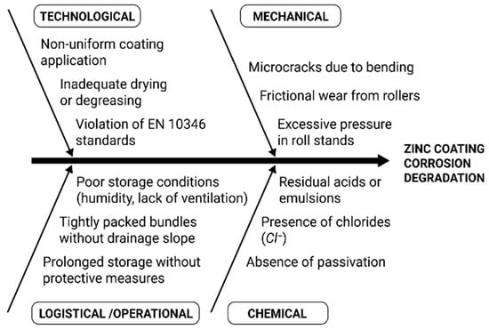 Process-related factors affecting zinc coating degradation at the coil production stage.