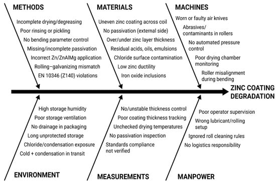 Ishikawa cause-and-effect diagram for zinc coating degradation.