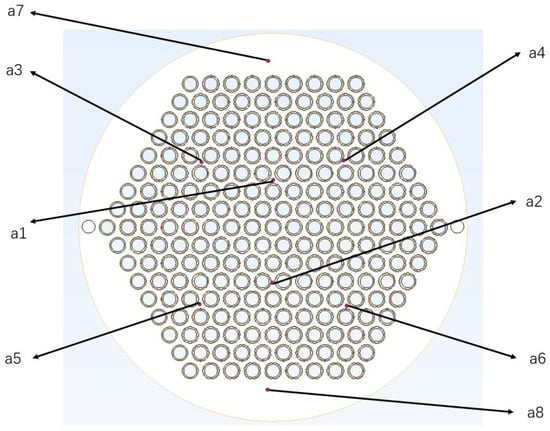 The welding sequence optimization uses tubesheet axial deformation as the optimization criterion. Due to welding, deformation of different locations is different. Therefore, we used simulation to calculate the welding deformation and then extracted the deformation data at some specific points and the maximum deformation of the tube sheet. These deformations were compared and analyzed to optimize the welding sequence. The positions of the specific points are shown in Figure 6.