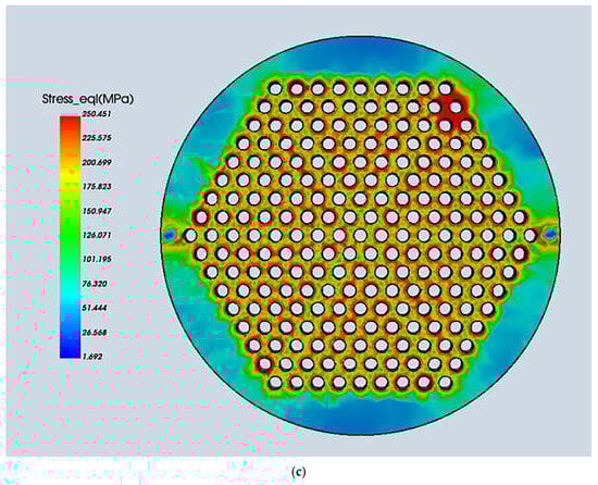 Laser welding features high energy density, rapid cooling, and a concentrated heat source. These characteristics result in relatively low residual stresses. Residual stresses are similar for all three welding sequences, ranging from 240 to 250 MPa. Despite this, stress concentration occurs at the end of the weld in all three sequences. High stresses are clearly present near the bottom row of tube sheets in Scheme 1 and the outermost sheets in Scheme 2. This phenomenon is attributed to the following reasons: