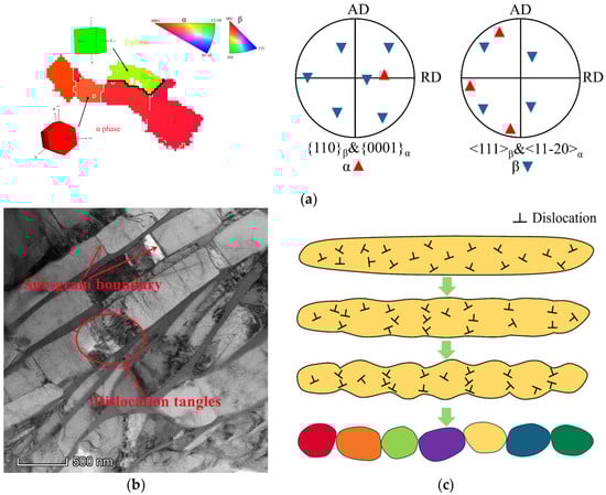 Microstructural evolution corresponding to a low strain rate of 0.01 s−1/910 °C: (a) pole correspondence between (0001)α and (110)β, (110)α and (111)β; (b) thermal groove and sub-grain boundary observed by TEM; (c) schematic diagram of the globularization mechanism.