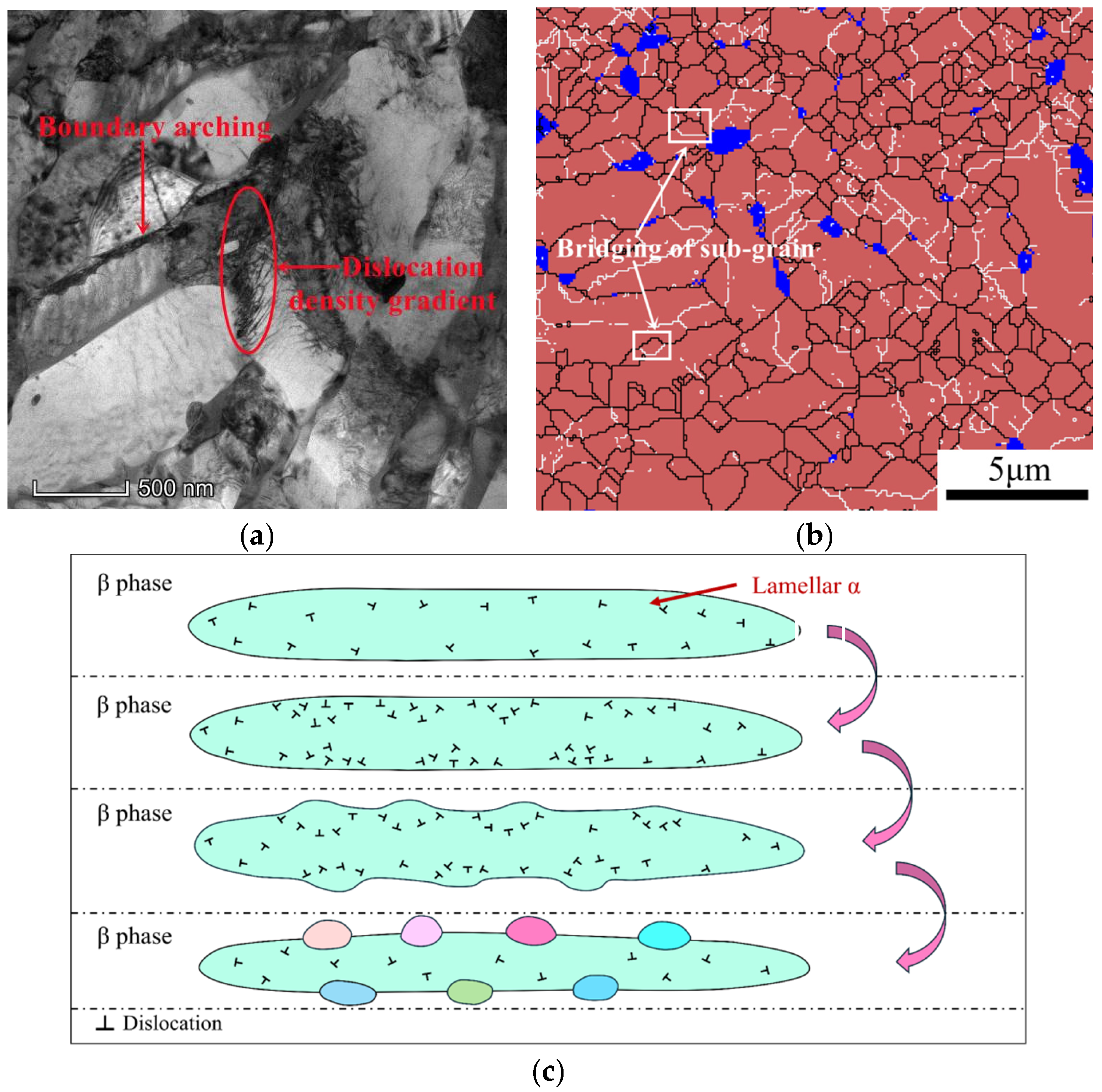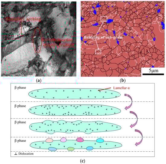 Microstructure characterization corresponding to a high strain rate of 0.1 s−1: (a) dislocation density gradient perpendicular to the α/β phase boundary by TEM observation; (b) bridging of the sub-grain at the arched grain boundary; (c) schematic diagram of the DDRX mechanism.