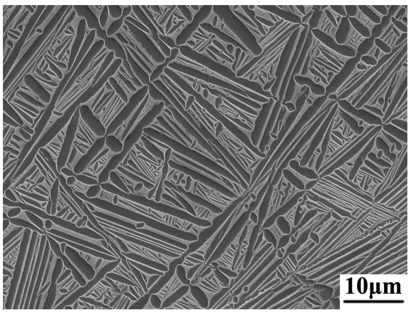 The raw material used in this study is a supplied BT25y rod blank, with a chemical composition of 6.44Al, 3.94Mo, 3.62Zr, 1.68Sn, 0.58W, 0.22Si, 0.09O, 0.046C, 0.01N, and 0.001H, and the remainder being Ti. The phase transition temperature was measured by the metallographic method at 965 °C. In order to obtain a lamellar structure, the original rod blank was first processed into short rods with dimensions of 15 mm × 100 mm. Next, the rods were annealed at 995 °C in the β single-phase region for 30 min and air-cooled to obtain the initial microstructure, as shown in Figure 1. The microstructure is entirely composed of a β-transformed structure with continuous prior grain boundaries and disorderly interwoven lamellar α precipitates on the β matrix. The lamellar α owns a large aspect ratio and a straight α/β phase boundary with the surrounding β matrix. Finally, several cylindrical specimens with dimensions of 10 mm × 15 mm were cut along the outer circumference of the short rod for isothermal compression.