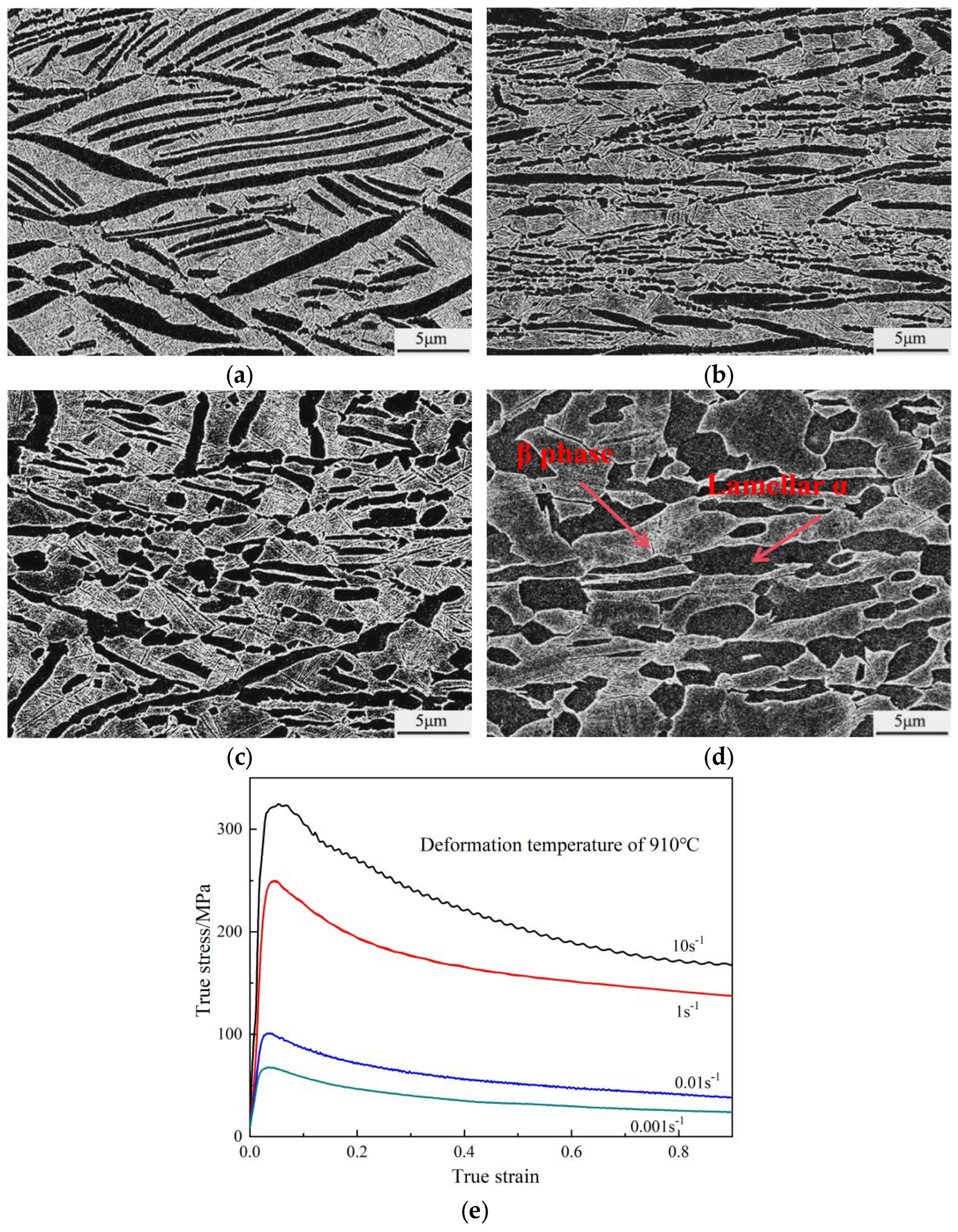 Microstructure corresponding to the deformation temperature of 910 °C and different strain rates of (a) 10 s−1; (b) 1 s−1; (c) 0.01 s−1; and (d) 0. 001 s−1; (e) corresponding true stress–strain curves.