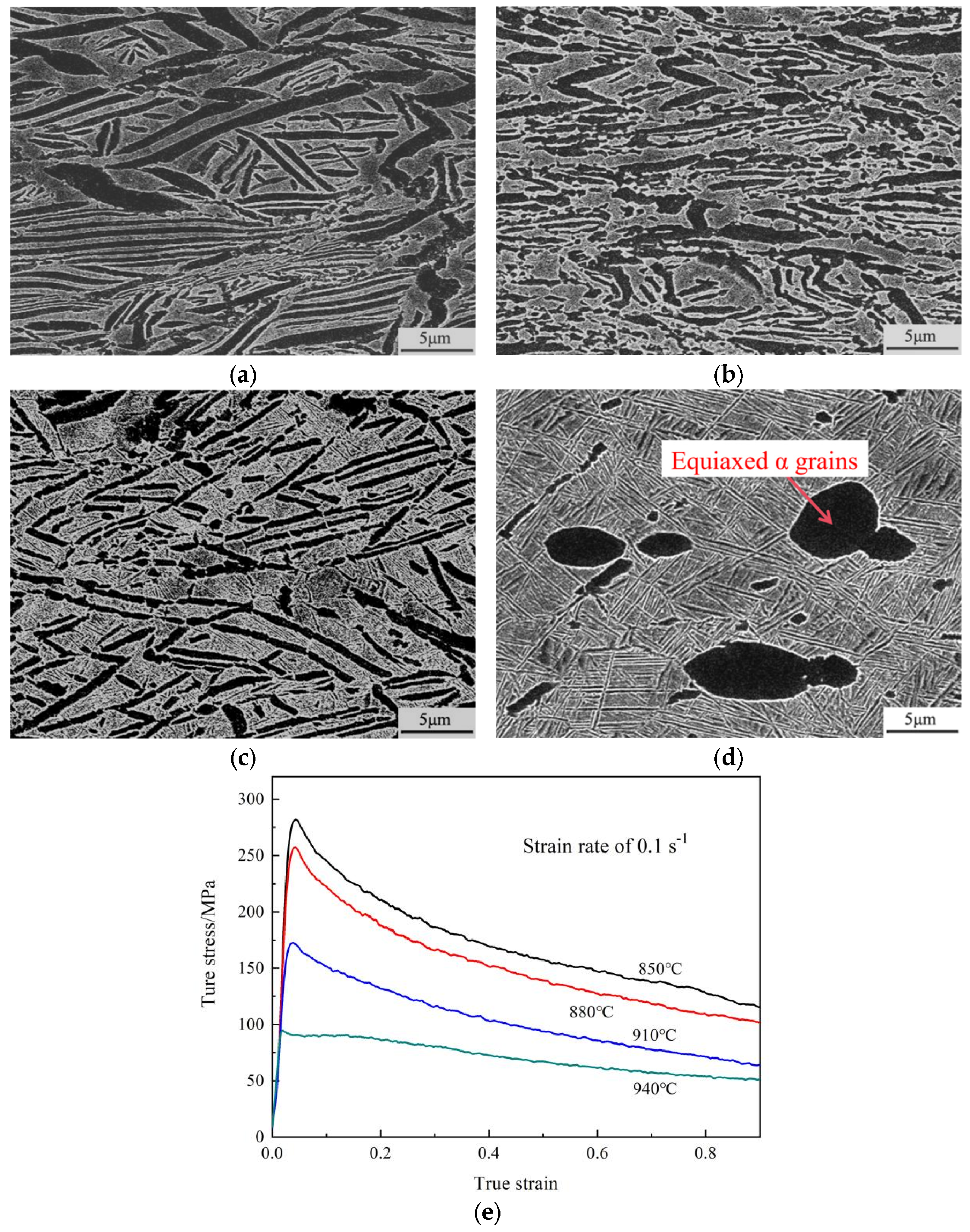 Microstructure corresponding to the strain rate of 0.1 s−1 and different deformation temperatures of (a) 850 °C; (b) 880 °C; (c) 910 °C; and (d) 940 °C; (e) corresponding true stress–strain curves.