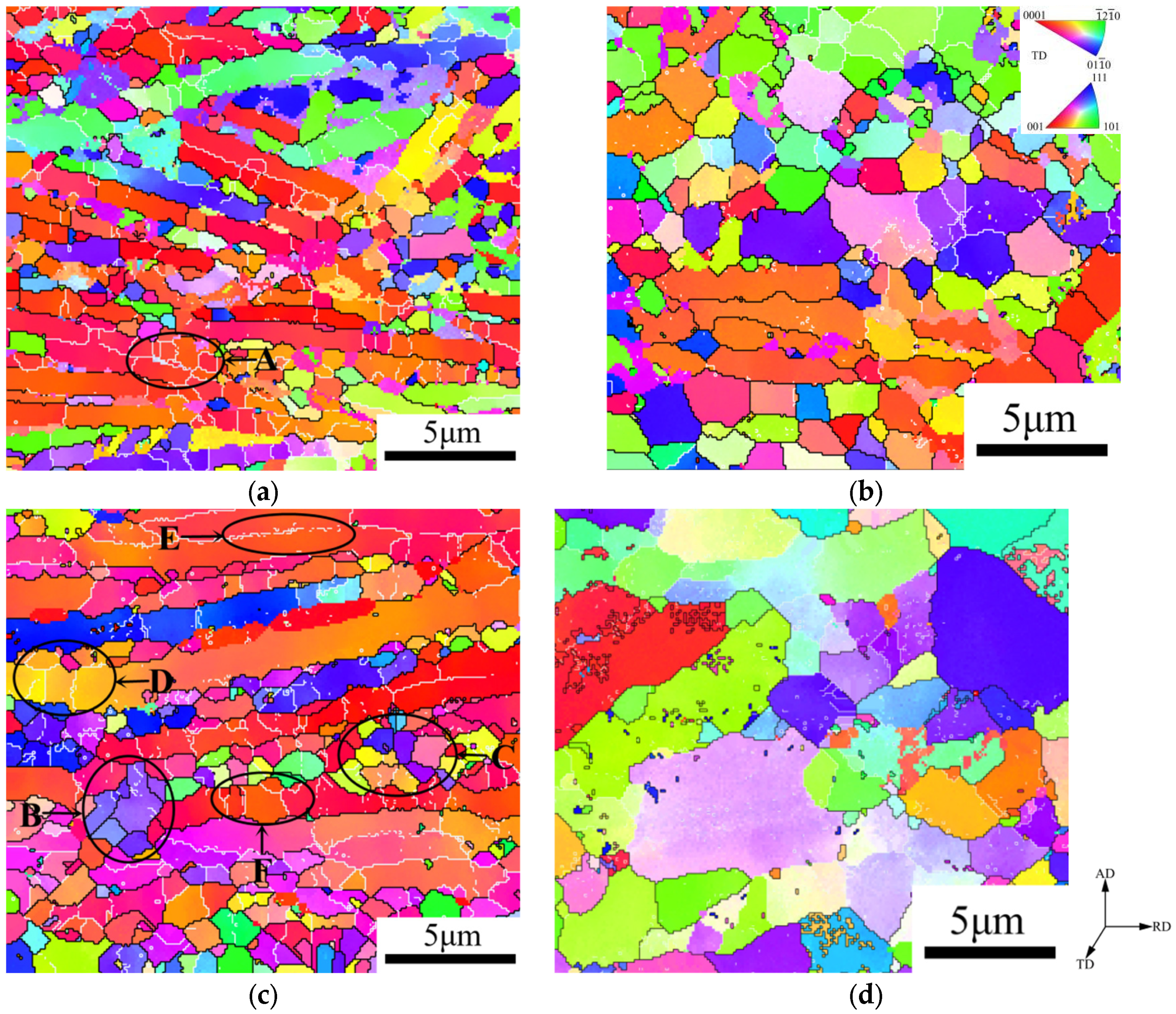 Figure 4c,d show the IPF plots of the BT25y alloy at different strain rates and the same deformation temperature of 880 °C. By comparing Figure 4c with Figure 4a, it can be observed that necklace-like structures composed of a series of small equiaxed α grains are generated along the grain boundaries of initial lamellar α as the deformation temperature decreases to 880 °C. It is worth noting that some equiaxed grains within these necklace-like structures have the same or similar orientations as adjacent grains, as indicated by Arrow B in Figure 4c. The other equiaxed grains present a significant misorientation with adjacent grains due to the different shear stress levels experienced by various parts of the primary lamellar α during the initial deformation stage, as indicated by Arrow C. The parts that experienced higher stress participate in the plastic deformation preferentially and become severely kinked first [20]. Dislocations proliferate, rearrange into sub-grain boundaries, and further transform into large-angle grain boundaries, resulting in significant orientation differences between adjacent grains. As the kinking degree of lamellar α increases, the previously less stressed parts may rotate to a favorable orientation and are able to participate in the plastic deformation in the subsequent deformation stage. Similarly, sub-grain boundaries form in these areas under the effect of dislocation rearrangement and polygonization. Therefore, the same or similar orientations can be observed among adjacent equiaxed α grains. Another notable phenomenon is that a large number of sub-grain boundaries generate in the directions either approximately parallel or perpendicular to the longitudinal axis of lamellar α, as indicated by Arrow D. Nevertheless, some sub-grain boundaries do not initiate from the α/β phase boundaries with higher distortion energy, but rather preferentially initiate from the interior of lamellar α, as indicated by Arrow E. These sub-grain boundaries intersect with each other, dividing the initial lamellar α into continuously distributed sub-grains with different sizes, as pointed by Arrow F. As the strain rate drops to 0.001 s−1, most of the initial α lamellae have already undergone complete dynamic globularization due to the long residence time at high temperatures. According to the statistics, the generated equiaxed α grains occupy about 71.9% of the total microstructure, which achieves the highest globularization rate among the four deformation parameters. Moreover, the newly formed equiaxed α grains suffer significant coarsening, with an average size of approximately 2.47 μm, which is obviously coarser than that of 880 °C/0.1 s−1.