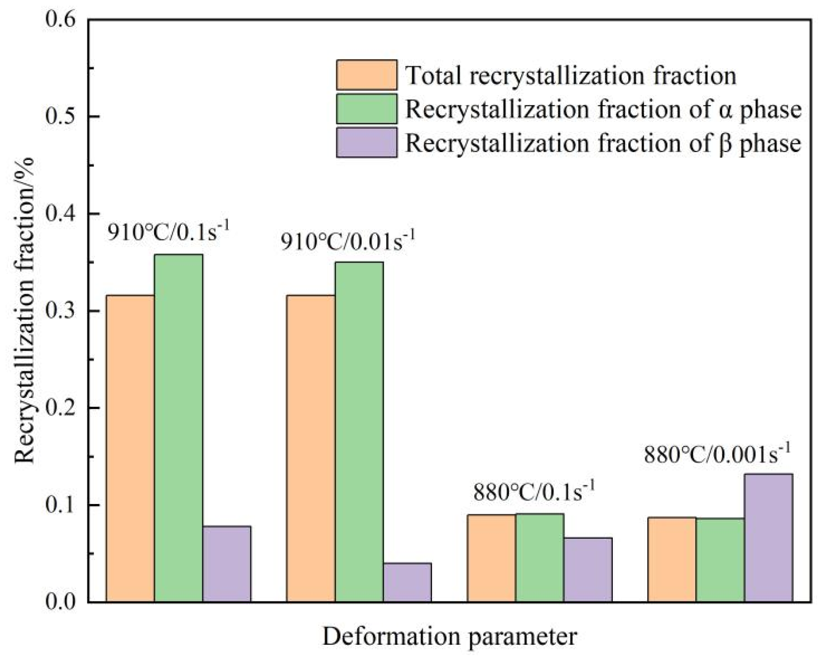 Recrystallization fraction of α and β phases under different deformation conditions.