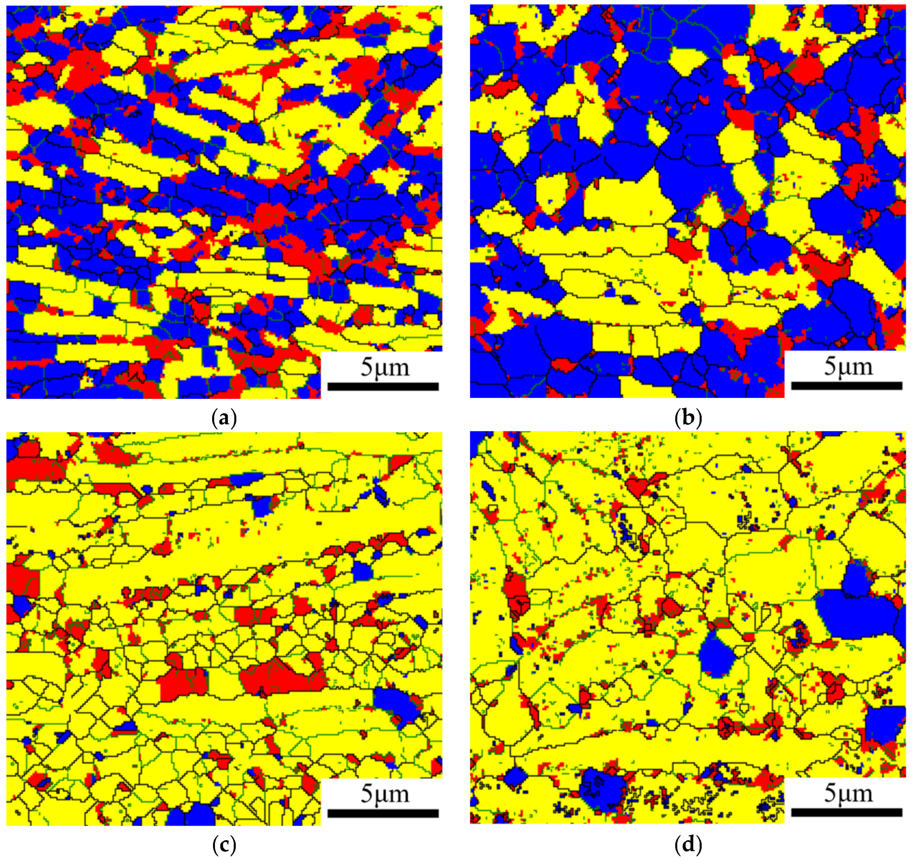 Recrystallization distribution maps under different deformation conditions (blue, recrystallized grains; yellow, recovered grains; red, deformed grains): (a) 910 °C/0.1 s−1; (b) 910 °C/0.01 s−1; (c) 880 °C/0.1 s−1; (d) 880 °C/0.001 s−1.