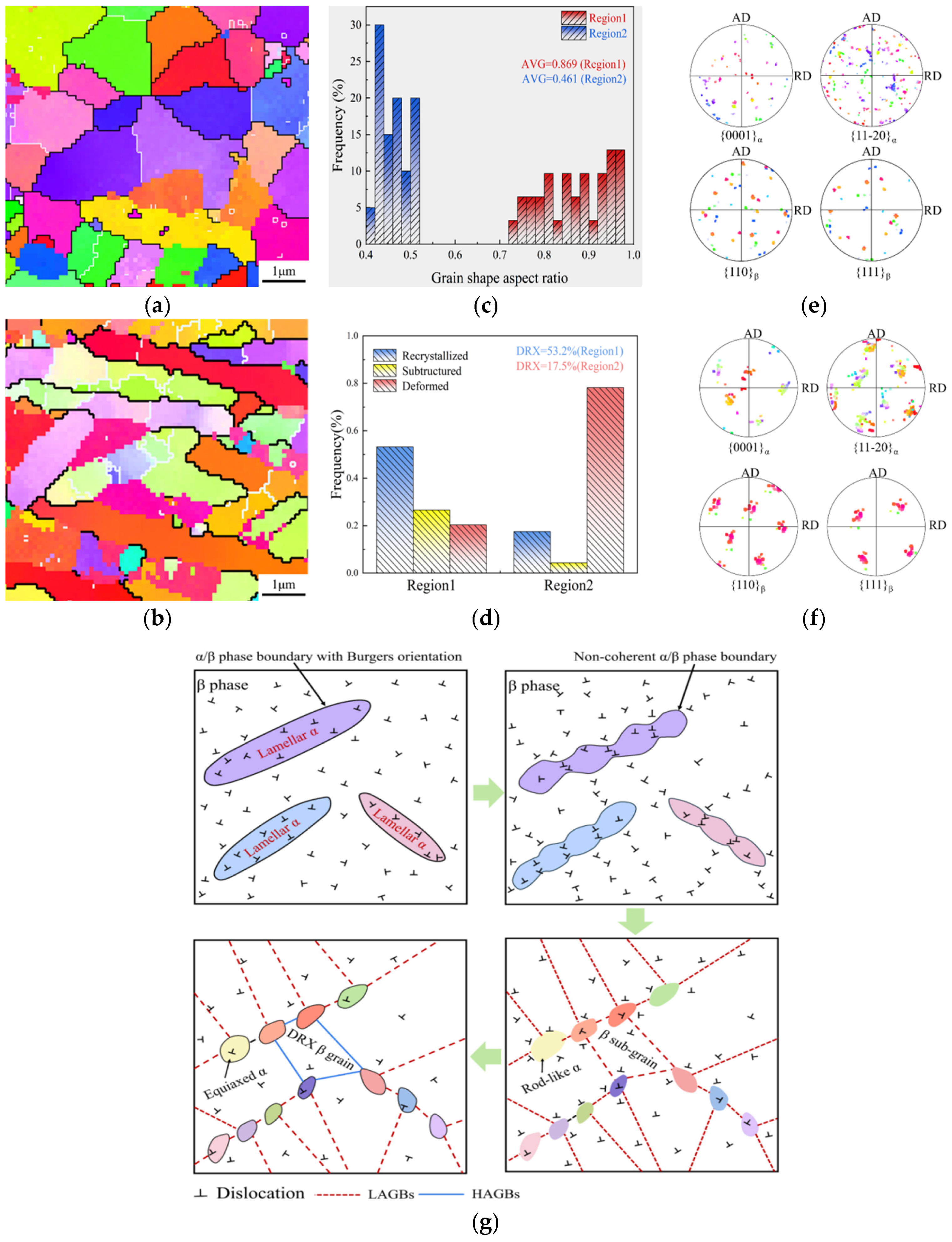 EBSD analysis results of Regions 1 and 2: (a,b) IPF maps; (c) the width-to-length ratio of the α phase; (d) the volume fraction of DRX grains in the β phase; (e,f) pole figures of Regions 1 and 2; (g) schematic diagram of the DRX mechanism in the β phase at the α/β phase boundary.