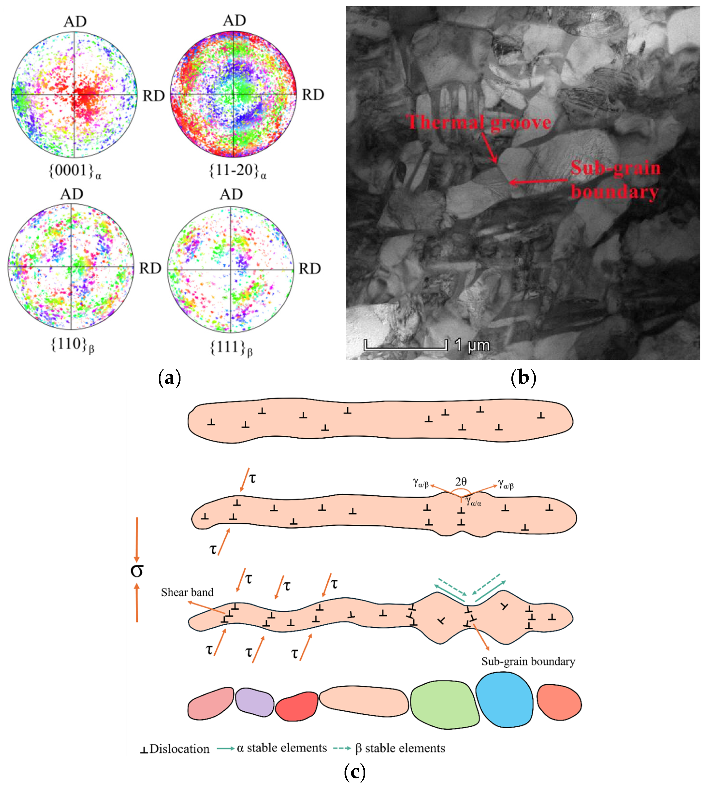 The evolution of the α/β phase boundary also has a significant effect on the dynamic globularization of lamellar α. As is well known, the phase boundary between the initial lamellar α and surrounding β matrix is generally presented in a straight contour, and the two phases usually maintain a Burgers orientation relationship [30]. The pole locations corresponding to the (0001) and (110) groups in the α phase and the (110) and (111) groups in the β phase shown in Figure 10a are dispersed, and the pole correspondence relationship between the two phases gradually disappears, indicating that the crystallographic orientations of the α phase and the β phase become much more random as the plastic deformation proceeds, and the Burgers relationship between lamellar α and the β matrix is disrupted. Therefore, when dislocations move from the interior of lamellar α to the α/β phase boundary, dislocations accumulate and pile up severely, which brings about a sharp increase in the distortion energy at the α/β phase boundary. Then, a large number of boundary atoms diffuse into the surrounding low-energy region, resulting in the alteration of atomic arrangement orientation on both sides of the α/β phase boundary and ultimately giving rise to the loss of interface coherency. According to previous studies [31,32], the loss of coherency at the α/β phase boundary leads to localized deformation within lamellar α, which results in the kinking of lamellar α at multiple sites and the formation of a serrated phase boundary contour. A large number of dislocations are generated at the kinking sites, which would further evolve into α/α sub-grain boundaries through glide, climb, and cross-slip. Meanwhile, some grain boundaries may slip under the effect of shear stress, contributing to the generation of shear bands, as shown in Figure 10c. The dihedral angle θ between these newly formed internal interfaces and neighboring α/β phase boundaries is very unstable [33]. In order to balance the interfacial energies between these internal interfaces and α/β boundaries, the dihedral angle θ would reduce spontaneously. Thus, thermal grooves generate at the junction of internal interfaces and α/β phase boundaries, as shown in Figure 10b. Then, α-stable elements would migrate from the α/α sub-grain boundary to neighboring α/β phase boundaries, while the β-stable elements diffuse in an opposite direction, resulting in the continuous wedge of the β phase into α lamellae along the α/α sub-grain boundary, as shown in Figure 10c. Once the β phase penetrates α lamellae, the initial lamellar α would be separated into several short rod-like or nearly equiaxed α grains. Then, these short rod-like α grains transform into small equiaxed α grains under the effect of terminal migration [34]. As a result, the dynamic globularization of lamellar α is achieved.