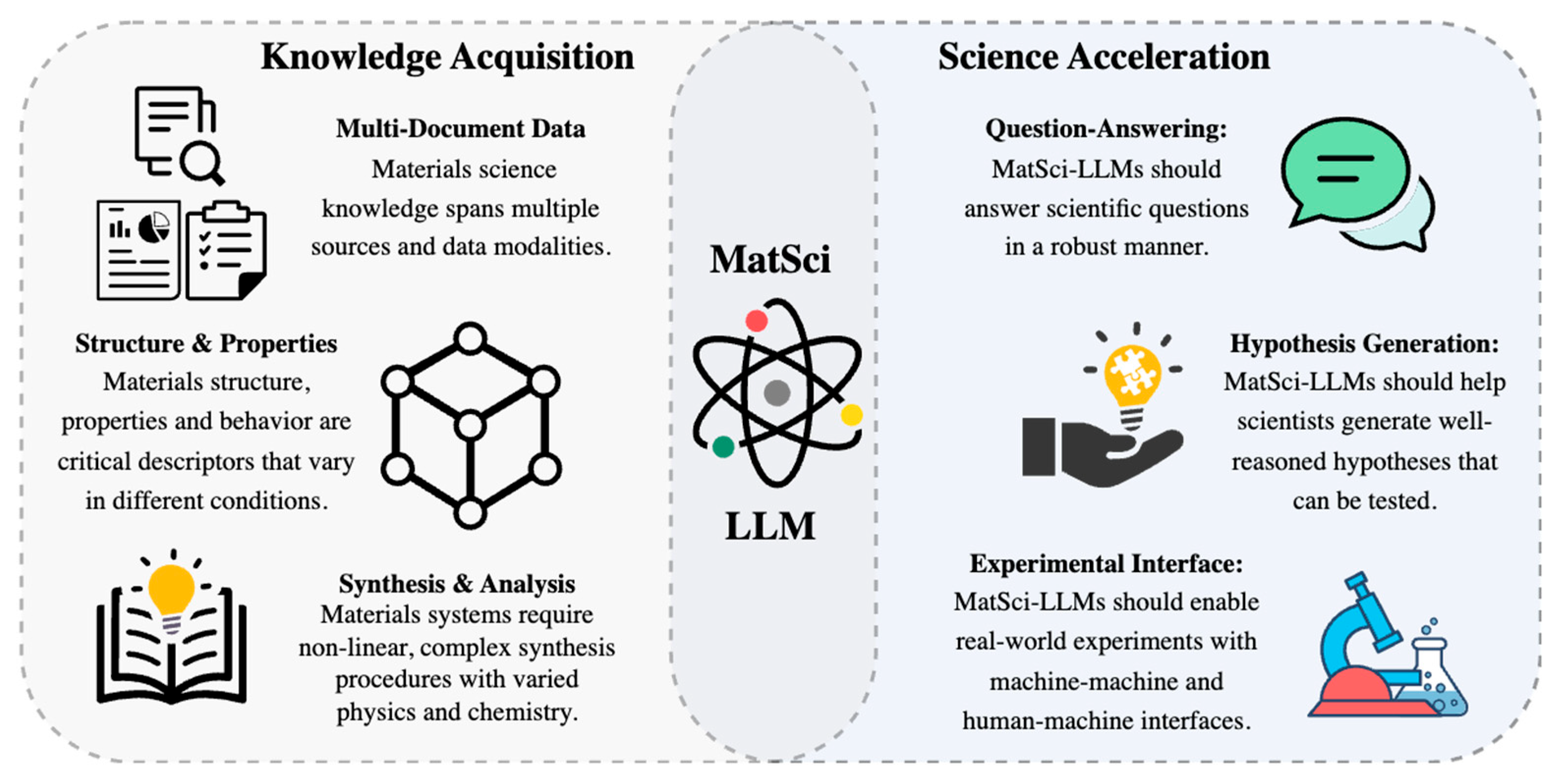- Zhang, J.; Chen, X.; Ye, X.; Yang, Y.; Ai, B. Large language model in materials science: Roles, challenges, and strategic outlook. Adv. Intell. Discov. 2025, 202500085. [Google Scholar] [CrossRef]
