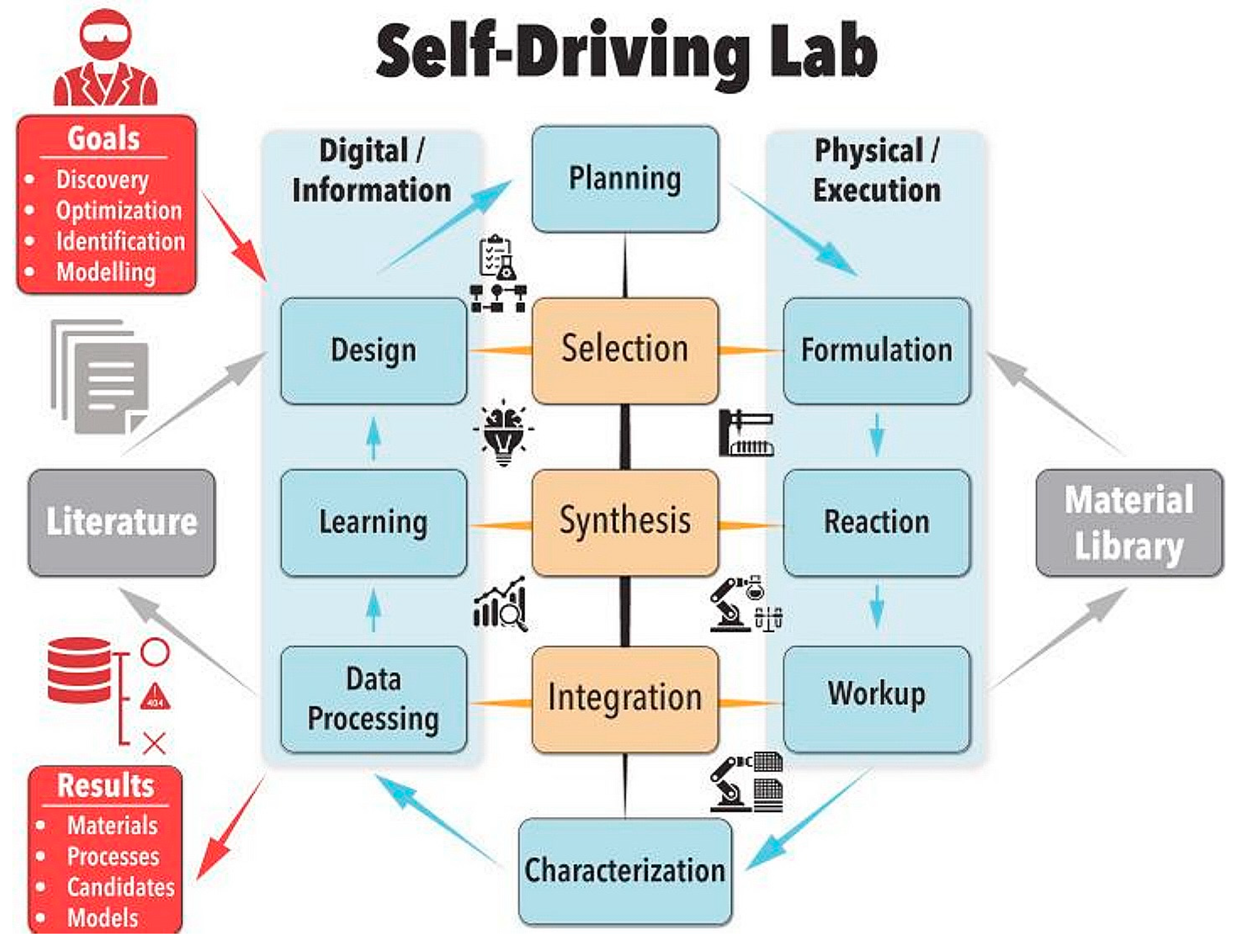 - Canty, R.B.; Bennett, J.A.; Brown, K.A.; Buonassisi, T.; Kalinin, S.V.; Kitchin, J.R.; Maruyama, B.; Moore, R.G.; Schrier, J.; Seifrid, M.; et al. Science acceleration and accessibility with self-driving labs. Nat. Commun. 2025, 16, 3856. [Google Scholar] [CrossRef] [PubMed]