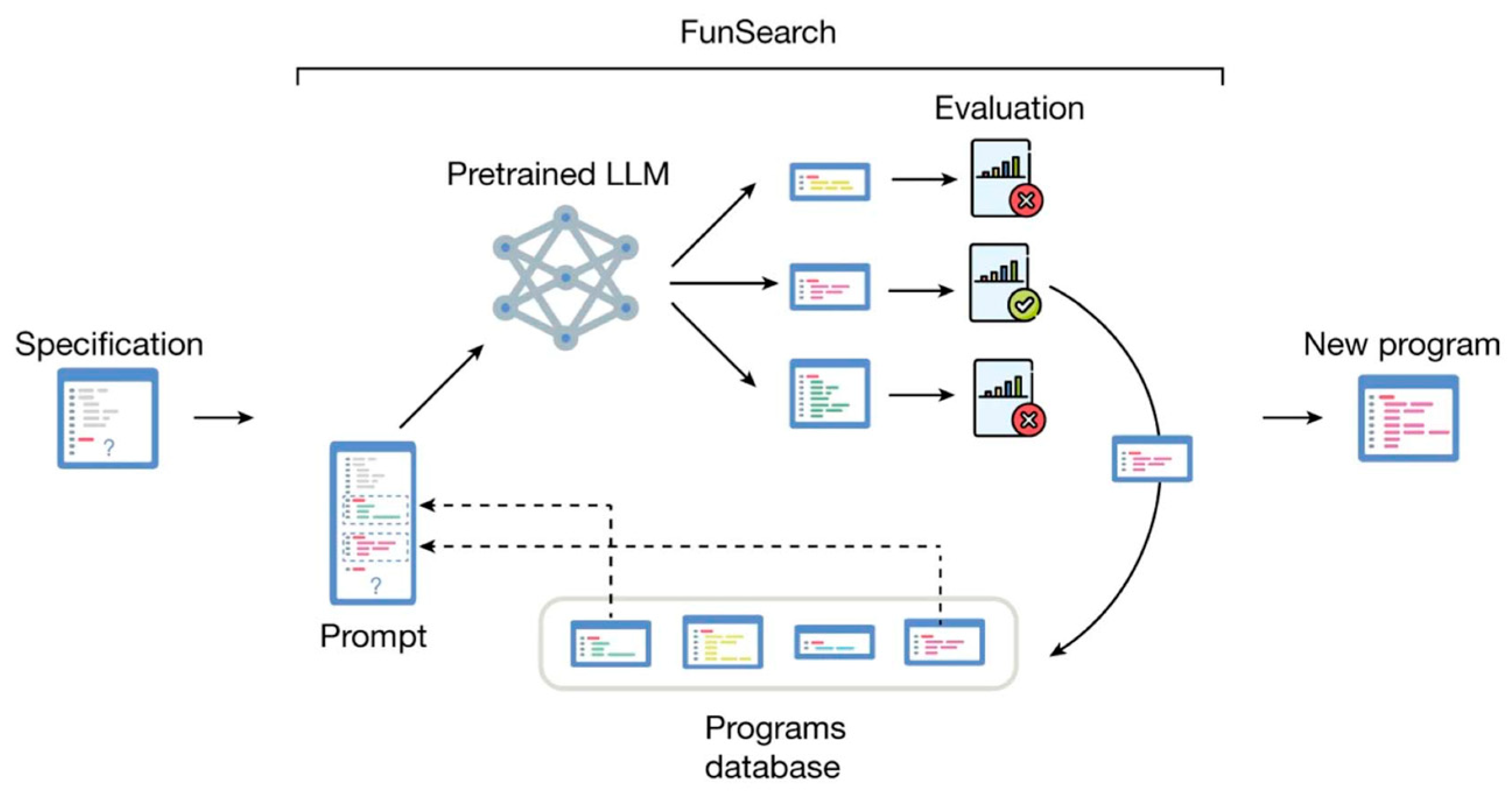 - Romera-Paredes, B.; Barekatain, M.; Novikov, A.; Balog, M.; Kumar, M.P.; Dupont, E.; Ruiz, F.J.R.; Ellenberg, J.S.; Wang, P.; Kohli, P.; et al. Mathematical discoveries from program search with large language models. Nature 2024, 625, 468–475. [Google Scholar] [CrossRef]