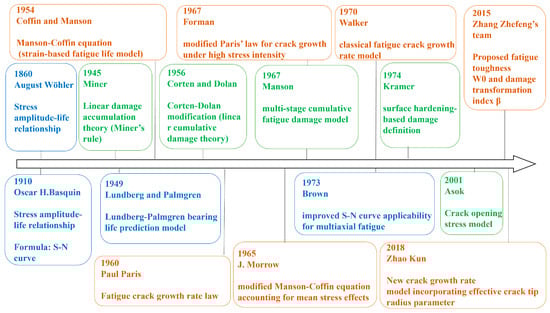 Fatigue life prediction models are primarily used to evaluate the failure life of materials or structures under cyclic loading. The fundamental theories and classical models can be categorized into stress–life (S-N) models, material damage accumulation theories, and crack initiation and propagation theories. The historical development of fatigue life prediction models is shown in Figure 9.