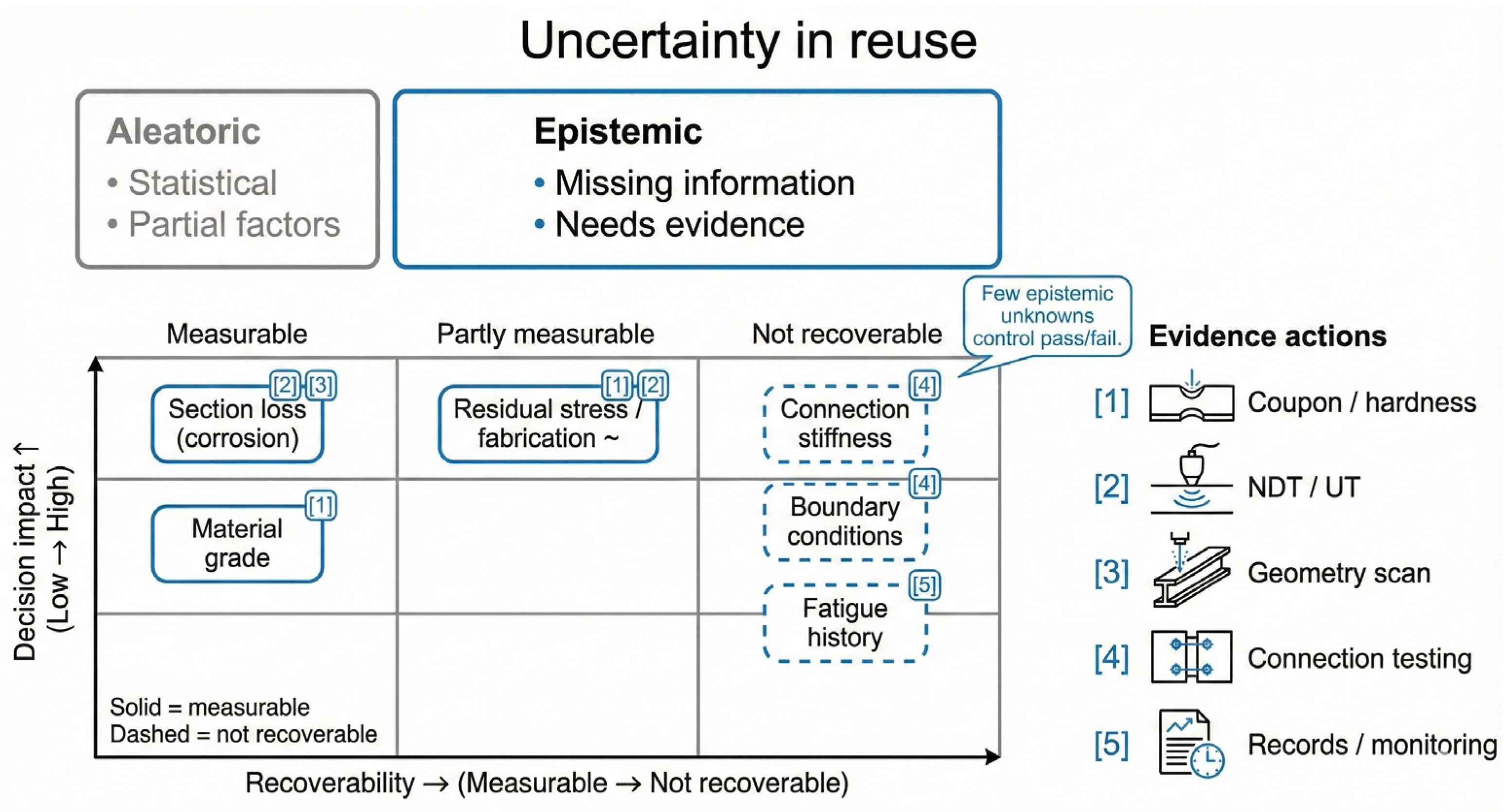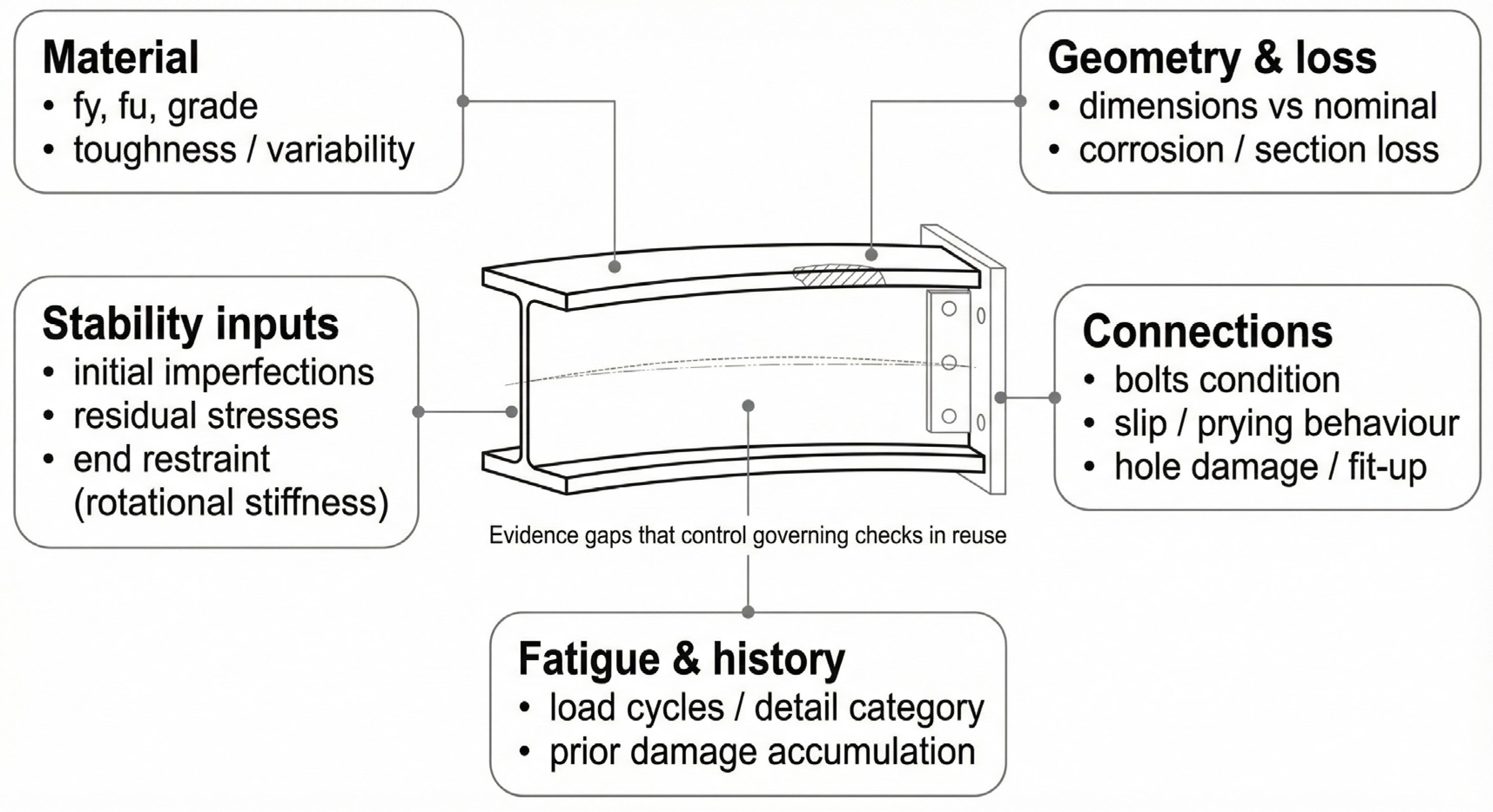 Structural steel reuse is still uncommon in current practice. In the UK, only around 7% of steel from end-of-life buildings is reused, while most is recycled as scrap [4]. The key issue is not technical feasibility. Steel sections are often reusable in principle. The barrier is decision reliability under incomplete information. Reclaimed members commonly arrive with weak documentation. Material grade may be unknown. Prior loading and exposure are often unclear. Damage and corrosion can be local and hard to quantify quickly. This is mainly epistemic uncertainty. It does not disappear with a visual inspection, and it is only partially reduced by limited testing. In this context, engineers tend to default to conservative assumptions because they still need to meet the same reliability targets. Typical examples are assuming the lowest plausible steel grade or treating section loss with crude reductions to stay on the safe side [5]. This approach protects safety, but it can also reject members that would pass if the critical unknowns were measured and reported properly. That is why reuse remains difficult to scale as a circular strategy, even when capacity is available [4]. In practice, the important unknowns are not only yield strength and section size. They also include connection details, local imperfections, residual stresses from fabrication and previous service, fatigue accumulation, and the real boundary conditions created by new connections. For slender members, small uncertainty in imperfections or end restraints can dominate the buckling check. For corroded members, uncertainty in local thickness loss can dominate class and capacity. For reused connections, uncertainty in slip, prying, and bolt condition can govern serviceability and robustness. Figure 1 summarizes the main evidence gaps that control governing checks in reused steel members.