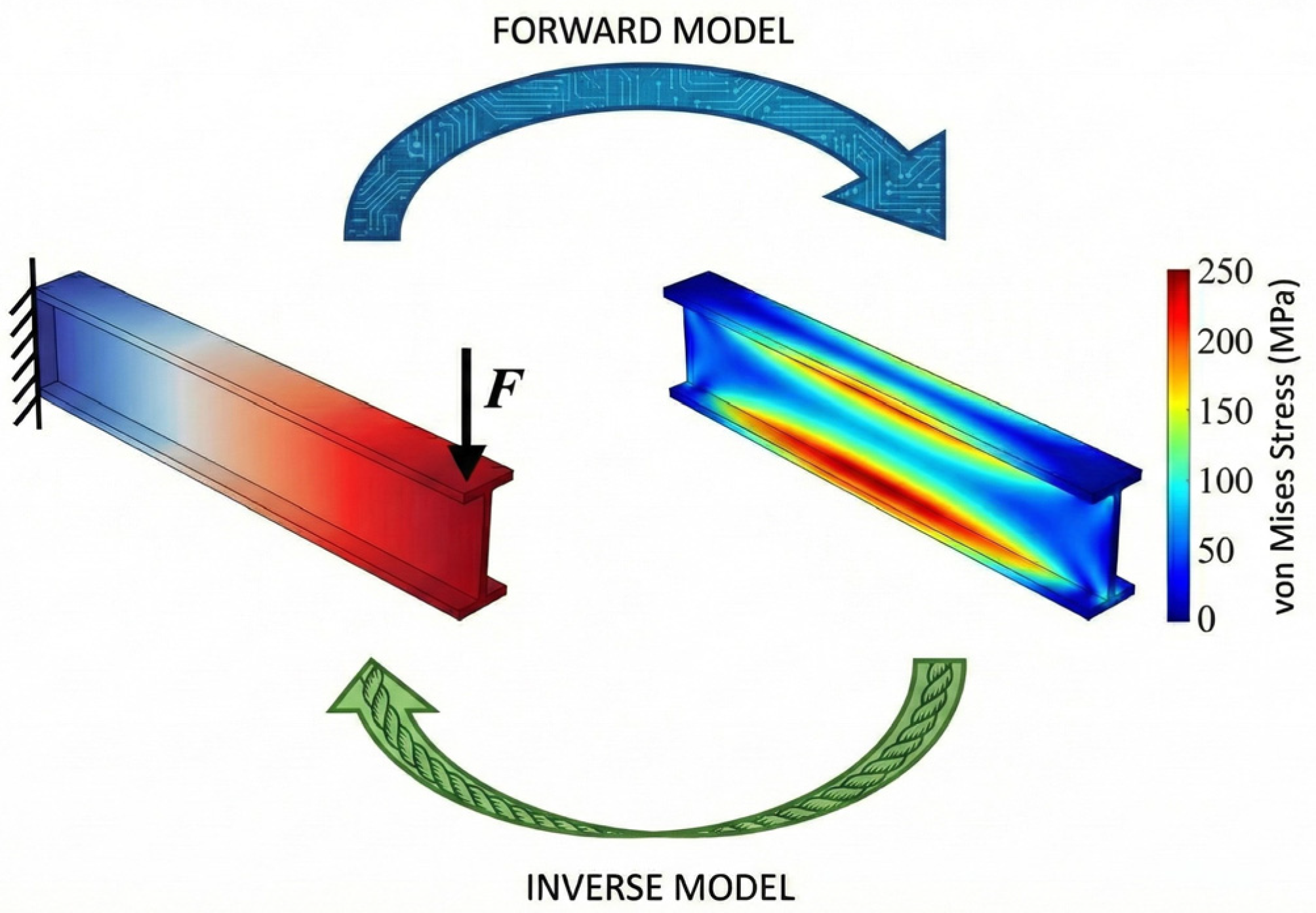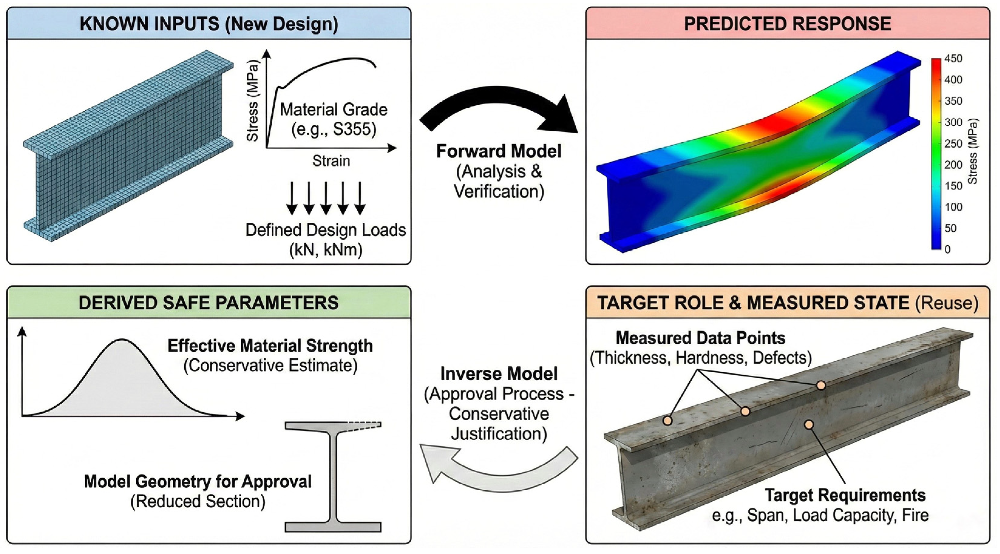 Structural engineering practice is, in general, organized around forward problems (see Figure 2). Given geometry, material properties, loads, and boundary conditions, the task is to evaluate structural response and verify compliance with design criteria. This logic implies the use of both analytical methodologies and numerical instruments, and it is well-suited for the design of new steel structures, where inputs are predominantly known and regulated. Steel reuse does not follow this approach (see Figure 3). In the new design, uncertainty is mostly handled by calibrated partial factors applied to well-defined variables. In reuse, the main uncertainty is often about the variables themselves.